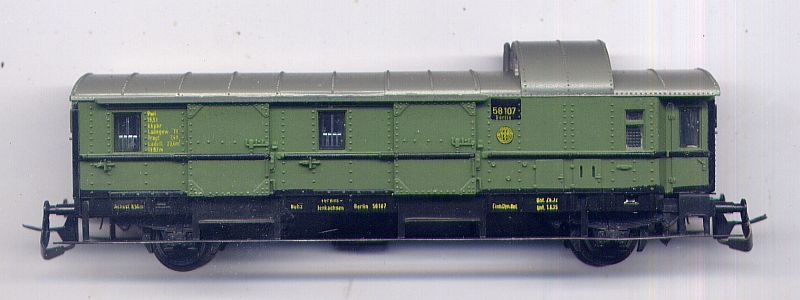 Erwerben Sie ein gut erhaltenes Modell eines zweiachsigen, grünen Einheits-Gepäckwagens vom Typ Pwi-30 der DRG (Deutsche Reichsbahn-Gesellschaft) für die Nenngröße TT. Hersteller des Modells war Berliner TT-Bahnen (DDR-Produktion).