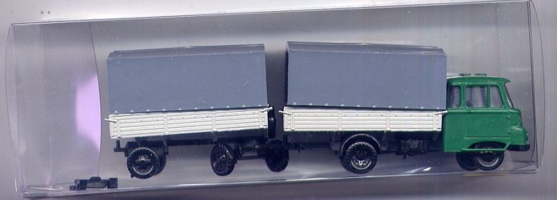 Erwerben Sie ein Modell eines DDR-Hängerzuges vom Typ Robur LO-2501 mit Pritsche / Plane und grünem Fahrerhaus für die Nenngröße H0. Hersteller des Modells ist SES / Modelltec. Das Fahrzeug ist unbespielte / unbenutzte Neuware und wird in der Originalverpackung ausgeliefert.