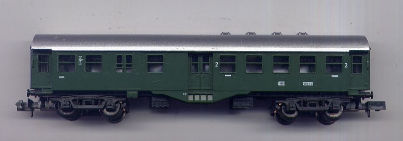Erwerben Sie ein gut erhaltenes Modell eines vierachsigen, grünen Personenwagens 2. Klasse mit Gepäckabteil (sog. Umbauwagen) der DB für die Nenngröße N. Hersteller des Modells war Arnold.