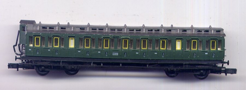 Erwerben Sie ein gut erhaltenes Modell eines vierachsigen, grünen Abteilwagens 3. Klasse mit hochgesetztem Bremserhaus für die Nenngröße N. Hersteller des Modells war Arnold.