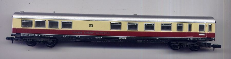 Erwerben Sie ein gut erhaltenes Modell eines vierachsigen, rot / beige-farbenen TEE-Speisewagens der DB für die Nenngröße N. Hersteller des Modells war Arnold.