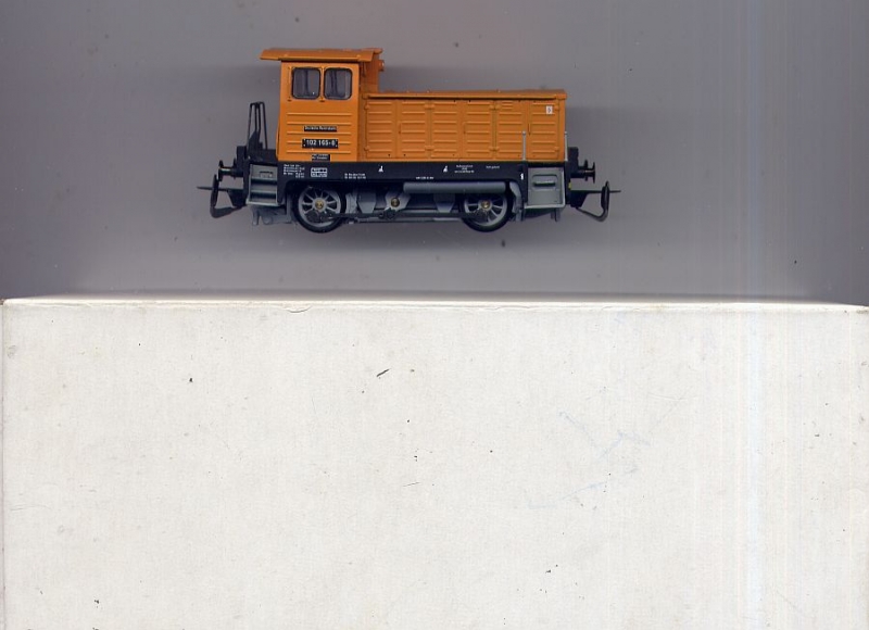 Erwerben Sie ein gut erhaltenes Modell einer zweiachsigen, gelben Rangier-Diesellok BR 102.1 der DR (die sog. "Gartenlaube") für die Nenngröße TT.