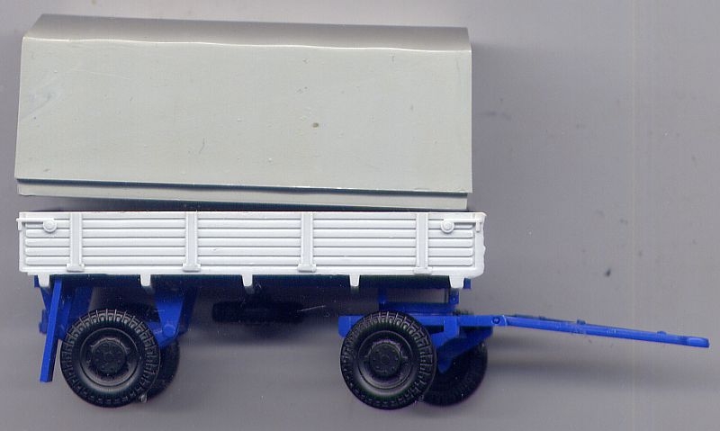 Erwerben Sie ein Modell eines hellgrauen DDR-Anhängers für LK und Traktoren mit Pritsche / Plane für die Nenngröße H0. Hersteller des Modells war SES / Modelltec.