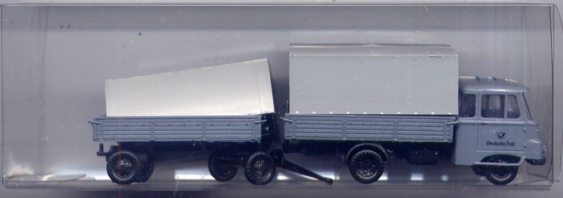 StartseiteH0H0-AutosRobur LO 2500-Hängerzug, Deutsche Post / Fernmeldebau (DDR), Pritsche / Plane, grau