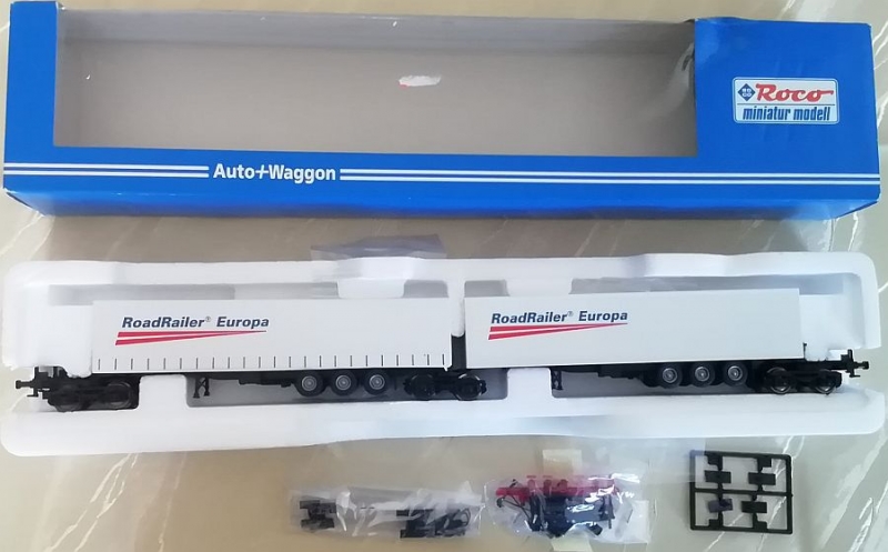 Erwerben Sie ein gut erhaltenes Modell einer zweiteiligen KombiRail Endwagen-Einheit in der abgebildeten Farbgebung / Bedruckung für die Nenngröße H0. Hersteller des Modells war Roco.
