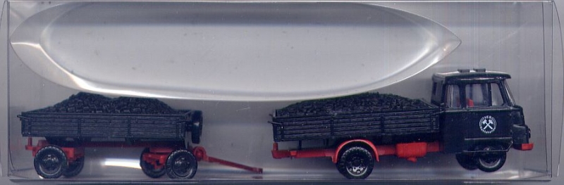 Erwerben Sie ein Modell eines schwarzen DDR-Hängerzuges vom Typ Robur LO 2500 des VEB Kohlehandel für die Nenngröße H0. Hersteller des Modells war SES / Modelltec. Das Modell ist unbespielte / unbenutzte Neuware und wird in der originalen Klarsicht-Verpackung ausgeliefert.