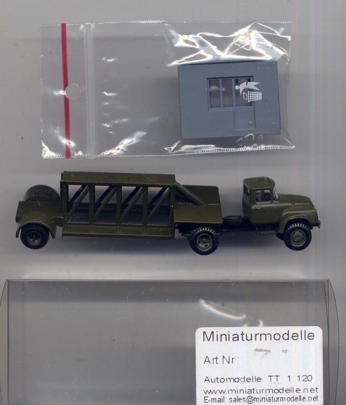 Erwerben Sie ein Modell eines armeegrünen, sowjetischen Tieflade-Sattelzuges vom Typ Zil 130, beladen mit 2 Plattenbau-Elementen für die Nenngröße TT. Hersteller des Modells war Miniaturmodelle.