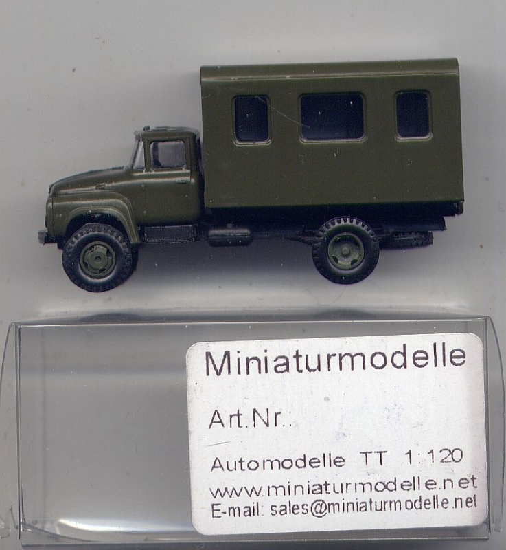 Erwerben Sie ein Modell eines armeegrünen, sowjetischen LKW´s vom Typ Zil 130 mit Werkstatt-Koffer für die Nenngröße TT. Hersteller des Modells war Miniaturmodelle.
