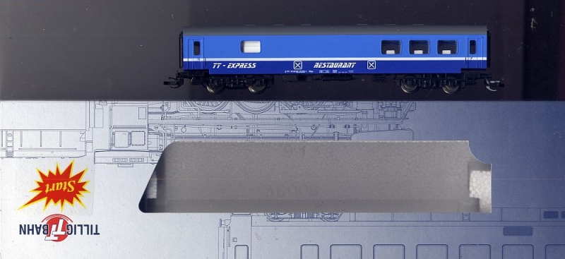 Erwerben Sie ein Modell eines vierachsigen, blauen Reko-Speisewagen "TT-Express" für die Nenngröße TT. Hersteller des Modells warTillig.
