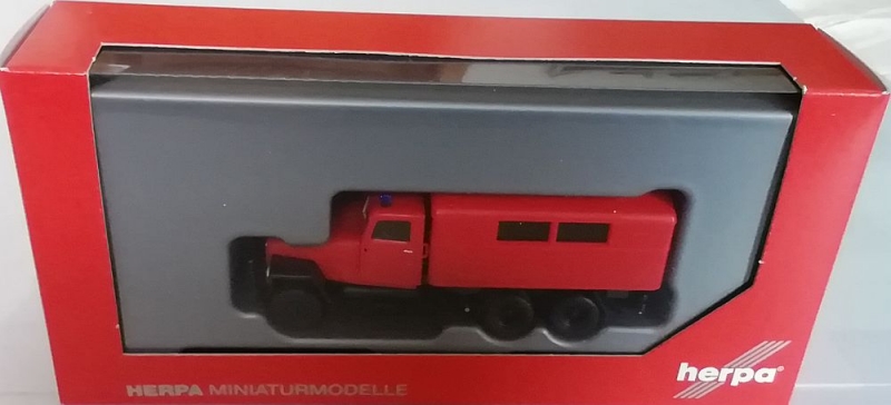 Erwerben Sie ein Modell eines roten DDR-LKW´s vom Typ IFA G5 der Feuerwehr mit 2fenstrigen Koffer-Aufbau für die Nenngröße H0. Hersteller des Modells war Herpa.