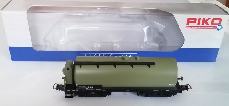 Erwerben Sie ein Modell eines vierachsigen, olivgrünen Kesselwagens der CSD (Tschechoslowakische Staatsbahnen) mit Bremserhaus für die Nenngröße H0. Hersteller des Modells war Piko. Das Modell ist unbespielte / unbenutzte Neuware und wird in der Originalverpackung ausgeliefert.