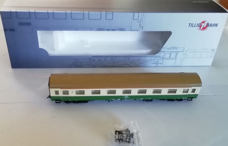 Erwerben Sie ein Modell eines vierachsigen, grün / elfenbein-farbenen Schnellzugwagens 1. Klasse vom Typ Ag (sog. Mod.-Wagen) der DR für die Nenngröße TT. Hersteller des Modells war Tillig.