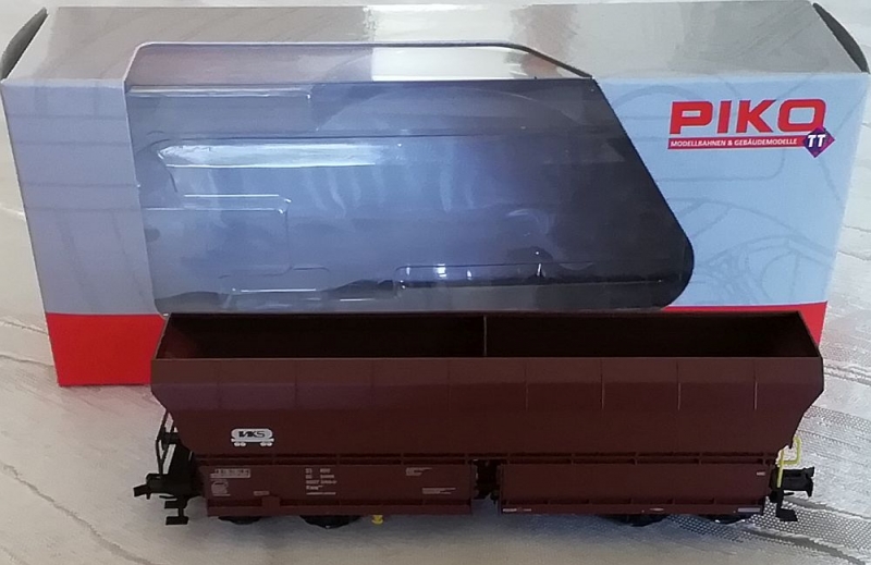 Erwerben Sie ein Modell eines vierachsigen, braunen Selbstentladewagens vom Typ Falns der VKS für die Nenngröße TT. Hersteller des Modells war Piko.