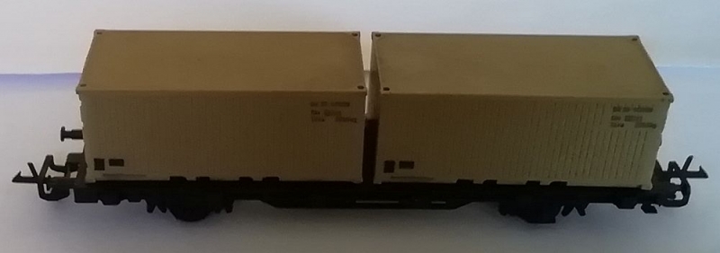Erwerben Sie ein gut erhaltenes Modell eines zweiachsigen Containerwagens, beladen mit 2 grauen Containern der DR für die Nenngröße TT. Hersteller des Modells war Zeuke, später dann Berliner TT-Bahnen (DDR-Produktion).