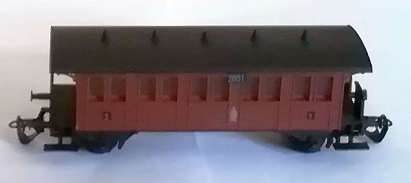 Erwerben Sie ein gut erhaltenes Modell eines zweiachsigen, braunen Oldtime-Personenwagens 3. Klasse der KPEV (Königlich Preußische Eisenbahn-Verwaltung) für die Nenngröße TT. Hersteller des Modells war Berliner TT-Bahnen (DDR-Produktion).