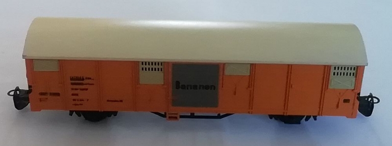 Erwerben Sie ein gut erhaltenes Modell eines zweiachsigen, orange-farbenen Bananenwagens der Gattung Gbs der DB mit silbergrauen Türen für die Nenngröße TT. Hersteller des Modells war Berliner TT-Bahnen (DDR-Produktion).