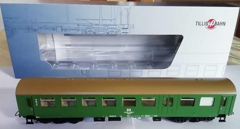 Erwerben Sie ein Modell eines vierachsigen, grünen Reko-Personenwagens der Gattung BDghws der DR mit Gepäckabteil und rehbraunem Dach für die Nenngröße H0. Hersteller des Modells war Tillig.