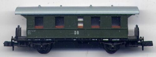 Erwerben Sie ein gut erhaltenes Modell eines zweiachsigen, grünen Personenwagens 2. Klasse (sog. "Donnerbüchse") der DR für die Nenngröße N. Bei diesem Wagen handelt es sich um ein Exemplar der kürzeren "Donnerbüchsen". Hersteller des Modells war Piko (DDR-Produktion).