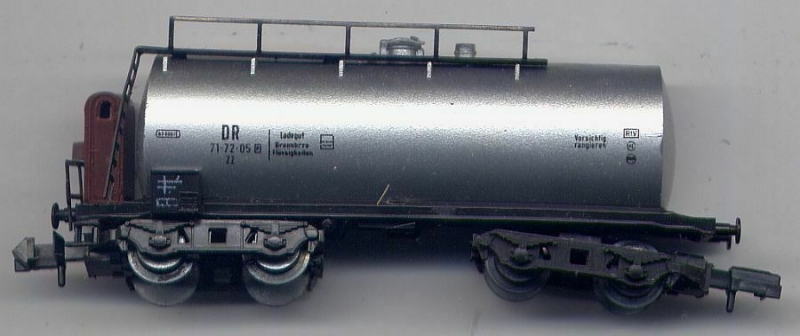 Erwerben Sie ein gut erhaltenes Modell eines vierachsigen, silbernen Kesselwagens der DR mit Bremserhaus für die Nenngröße N. Hersteller des Modells war Piko (DDR-Produktion).