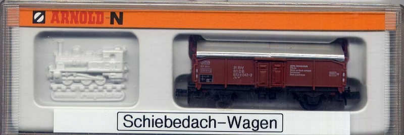 Erwerben Sie ein gut erhaltenes Modell eines zweiachsigen, braunen Hubschiebedachwagens der DB für die Nenngröße N. Hersteller des Modells war Arnold.