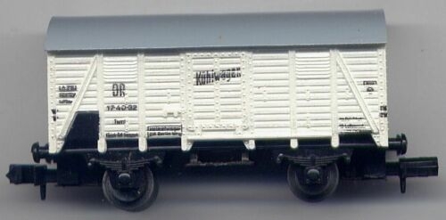 Erwerben Sie ein gut erhaltenes Modell eines zweiachsigen Kühlwagens der DR mit Tonnendach für die Nenngröße N. Hersteller des Modells war Piko.
