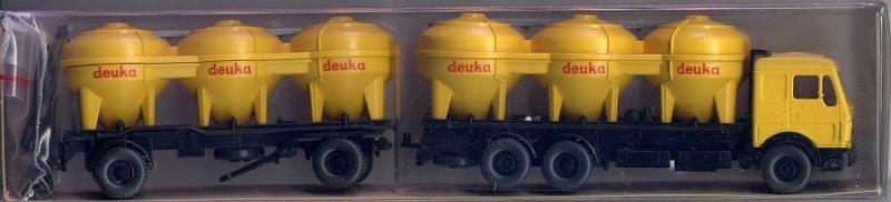 Erwerben Sie ein gut erhaltenes Modell eines gelben Silo-Hängerzuges "Deuka" vom Typ Mercedes für die Nenngröße H0. Hersteller des Modells war Wiking.