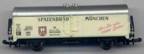 Erwerben Sie ein gut erhaltenes Modell eines zweiachsigen, modernen Bier-Kühlwagens "Spaten-Bräu München" für die Nenngröße N. Hersteller des Modells war Lima.