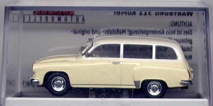 Erwerben Sie Modell eines elfenbein / weißen DDR-PKW´s vom Typ Wartburg 311 Camping für die Nenngröße H0. Hersteller des Modells ist Brekina.