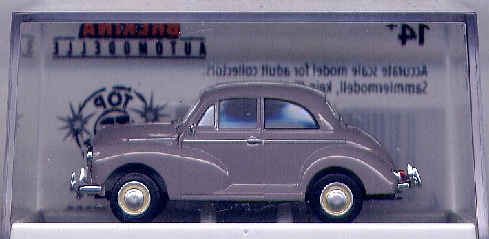Erwerben Sie Modell eines grauen Oldtime-PKW´s vom Typ Morris Minor für die Nenngröße H0. Hersteller des Modells ist Brekina.