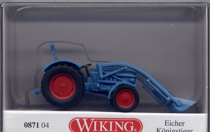 Erwerben Sie Modell eines blauen Traktors vom Typ Eicher Königstiger für die Nenngröße H0. Hersteller des Modells ist Wiking.