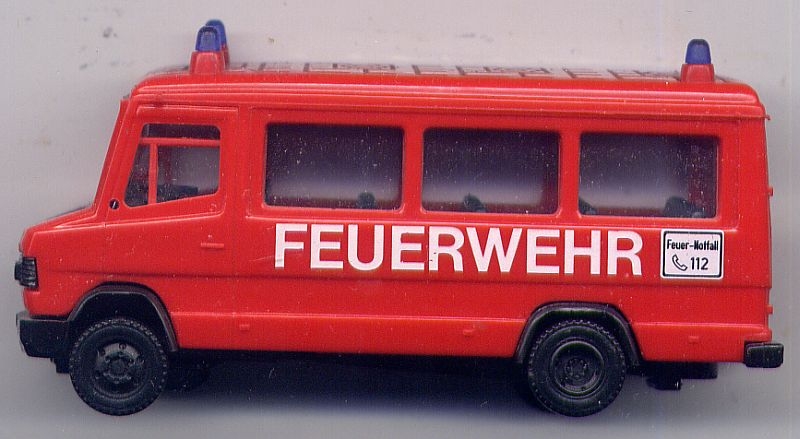 Erwerben Sie gut erhaltenes Modell eines roten Feuerwehr-Kleinbusses vom Typ Mercedes 507D für die Nenngröße H0. Hersteller des Modells war die Fa. Praline.