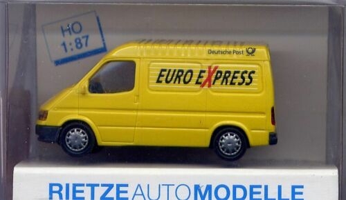 Erwerben Sie ein Modell eines gelben Kleintransporters "EuroExpress" vom Typ Ford Transit für die Nenngröße H0. Hersteller des Modells war die Fa. Rietze.