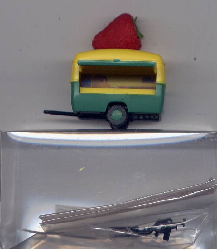 Erwerben Sie ein Modell eines Erdbeer-Verkaufsanhängers in der abgebildeten Farbgebung für die Nenngröße H0. Hersteller des Modells ist SES / Modelltec. Das Modell ist unbespielte / unbenutzte Neuware und wird in der Originalverpackung ausgeliefert. Die Zurüstteile liegen selbstverständlich bei.