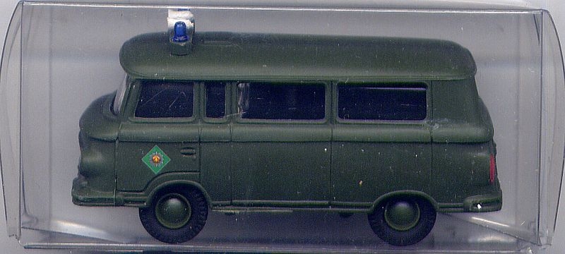 Erwerben Sie ein Modell eines grünen Einsatzfahrzeuges der (DDR-)Bereitschaftspolizei vom Typ Barkas B1000 für die Nenngröße H0. Hersteller des Modells war SES / Modelltec. Das Modell ist unbespielte / unbenutzte Neuware und wird in der Originalverpackung ausgeliefert.